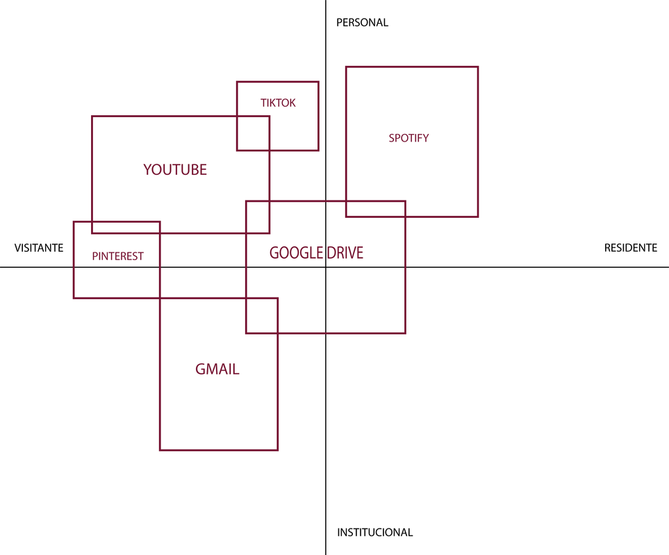 Para poder explicar esta idea con mayor claridad y aplicarla directamente al diseño, he desarrollado mi propia versión del concepto: un mapeo que organiza y visualiza las distintas herramientas y plataformas digitales según esta doble categorización de Residente y Visitante.